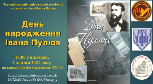 2 лютого 2021 року виповнилось 176 років від дня народження знаменитого фізика і електротехніка, винахідника “X”-променiв, перекладача Біблії, відомого громадсько-політичного діяча, вченого і патріота України – Івана Пулюя. Урочисте дійство проходило онлайн у зв’язку із пандемією коронавіру Covid-19. Організатором заходів виступив Тернопільський національний технічний університет імені Івана Пулюя. З вступним словом звернувся до учасників Петро Ясній, доктор технічних наук, професор, заслужений діяч науки і техніки України, ректор навчального закладу, президент Тернопільського обласного відділення МАН України. Програма заходу передбачала:
