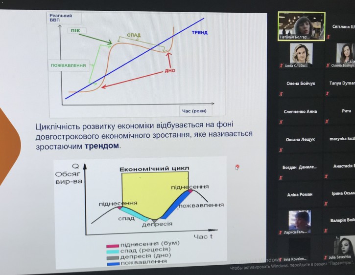 Доповідачка ознайомила присутніх із постаттю Саймона (Шимона) Кузнеця, який отримав Нобелівську премію з економіки. Саме цей вчений ввів у науку поняття валового внутрішнього продукту (ВВП). Концепція ВВП з'явилася в доповіді, яку Кузнець підготував для конгресу США в 1934 році. Вже в 1944 році ВВП став основним мірилом економіки країн, яким залишається і донині. Вчений був першим, хто займався вивченням взаємозалежності між економічними коливаннями і довгостроковим економічним зростанням. Викладач розповіла про чотири фази економічного циклу. На завершення он-лайн зустрічі Наталія Болгарова розповіла, що Національний університет біоресурсів і природокористування проводить «Інтелектуальний батл -2021», переможці якого отримають цінні подарунки. |