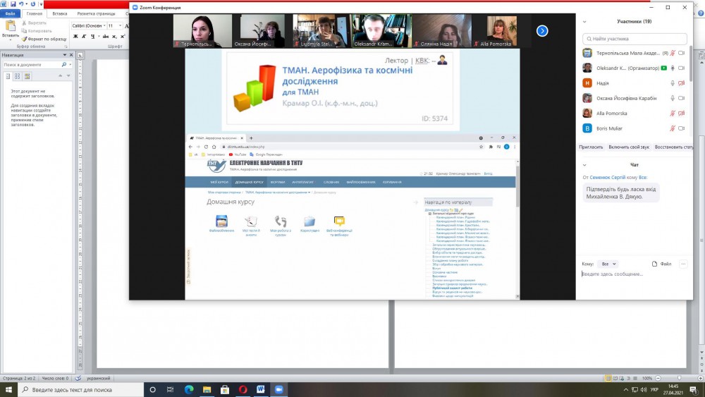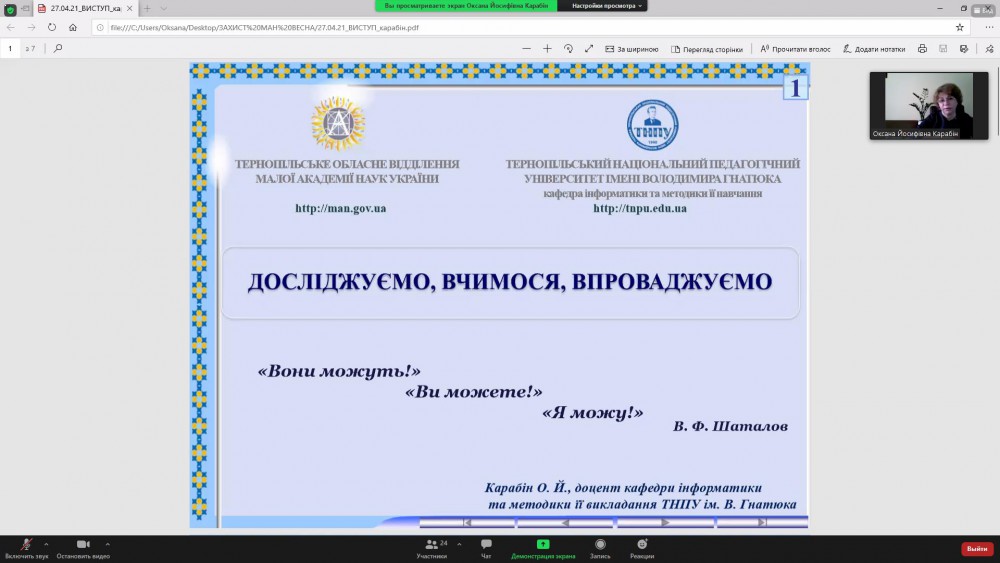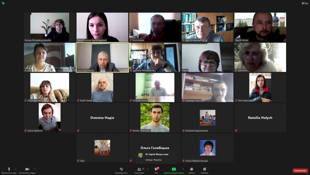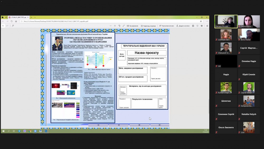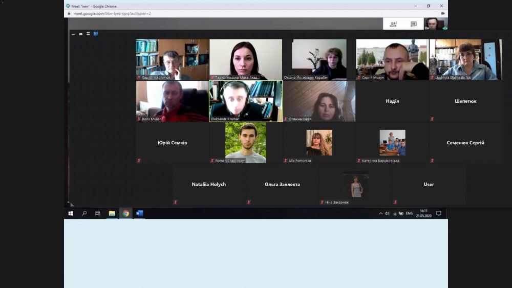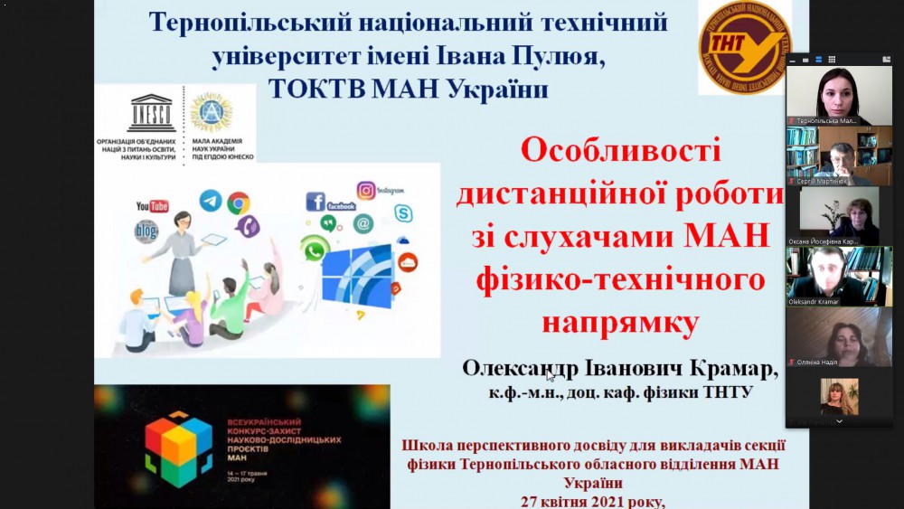 Онлайн-семінар для викладачів, наукових керівників секцій науково-технічного відділення 28.04.2021![]() 27 квітня 2021 року відбувся онлайн-семінар для викладачів, наукових керівників секцій науково-технічного відділення Тернопільського обласного комунального територіального відділення Малої академії наук України за підсумками ІІ етапу Всеукраїнського конкурсу-захисту науково-дослідницьких робіт учнів-членів МАН України.