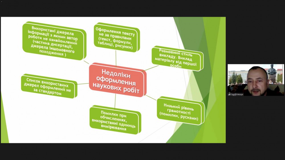 Під час відкриття семінару методист науково-технічного відділення Сікора Ю. Г. проаналізувала участь слухачів технічного спрямування у ІІ та ІІІ етапах Всеукраїнського конкурсу-захисту науково-дослідницьких робіт за останні три роки. Перед учасниками семінару виступив Крамар О. І., кандидат фізико-математичних наук, доцент ТНТУ імені І. Пулюя, який поділився досвідом підготовки слухачів до конкурсу-захисту та загалом про специфіку організації роботи під час дистанційного навчання. Мосій О. Б., кандидат економічних наук, доцент ЗУНУ розповіла про академічну доброчесність в освітній діяльності та факти виявлення плагіату у відділенні економіки. Про недоліки в написанні наукових робіт у відділенні комп’ютерних наук виступив Мартинюк С. В., кандидат фізико-математичних наук, доцент ТНПУ імені В. Гнатюка. Як організувати учня під час написання наукової роботи вела мову Карабін О. Й., кандидат педагогічних наук, доцент ТНПУ імені В. Гнатюка, а також Оксана Йосифівна презентувала зразки оформлення постерів під час захисту слухача. Мохун С. В., кандидат технічних наук, доцент ТНПУ імені В. Гнатюка розповів про особливості підготовки науково-дослідницьких проєктів у відділенні фізики та астрономії, підсумував недоліки оформлення наукових робіт, постерів та закцентував увагу на дотриманні регламенту під час захисту. На завершення семінару, Стельмащук Л. В., кандидат фізико-математичних наук, викладач Відокремленого структурного підрозділу «Гусятинський фаховий коледж Тернопільського національного технічного університету імені Івана Пулюя» поділилася досвідом налагодженої співпраці «учитель-учень», як вибрати цікаву тему для написання роботи, побажала усім плідної співпраці, розширювати кругозір, виходити за рамки шкільної програми, не зупинятися на досягненому. |