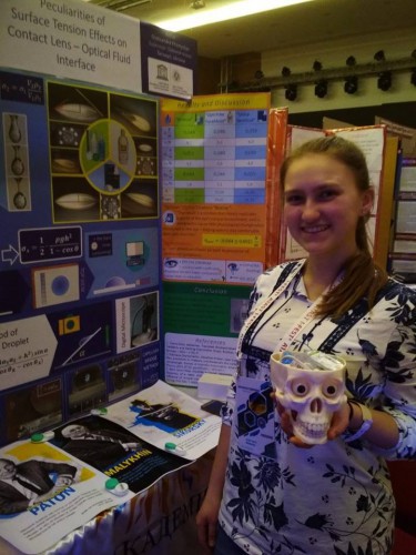 Юна дослідниця представляла власну наукову роботу на тему: «Особливості ефектів поверхневого натягу на інтерфейсі контактна лінза – офтальмологічна рідина». Олександра Хомишин за своє дослідження нагороджена бронзовою медаллю Туніської асоціації майбутнього науки і техніки (АTAST).